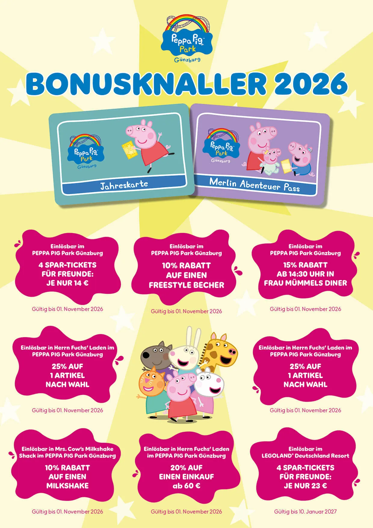 - Merlin Abenteuer Pässe, die nicht im PEPPA PIG Park Günzburg oder im LEGOLAND Deutschland gekauft wurden, erhalten keine Bonuskarte.